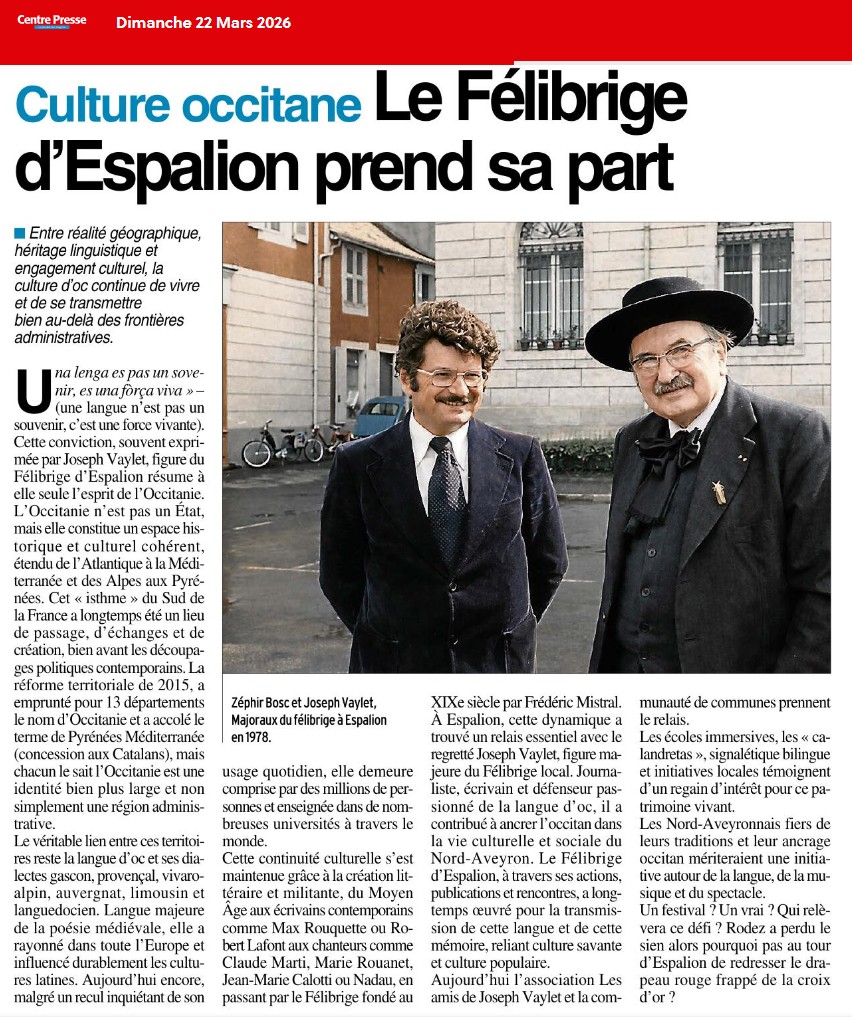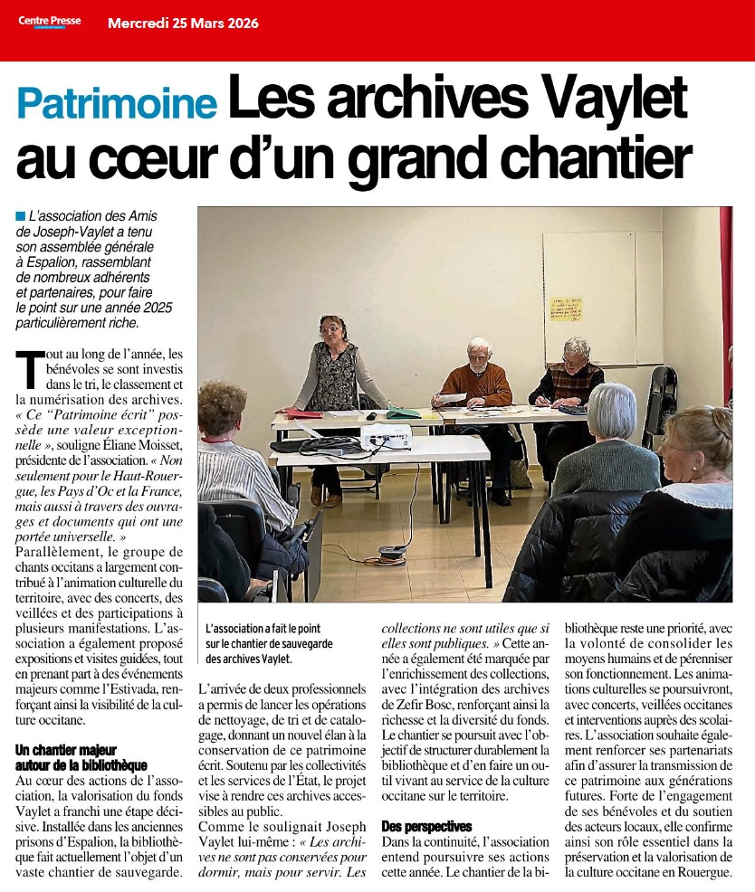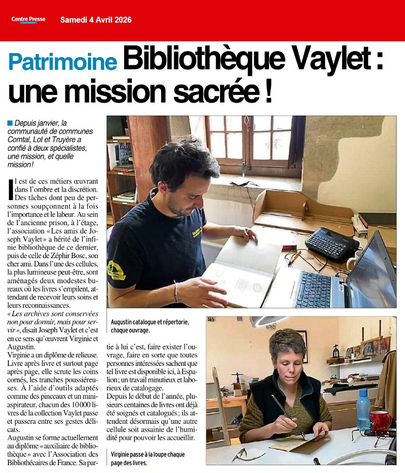 Merci à l’association « Les Amis de Joseph Vaylet » et à la mairie d’Espalion de contribuer à ce projet d’envergure qui fait écho aux devises de Joseph Vaylet : « Les archives sont conservées non pour dormir mais pour servir. » « Les collections ne sont utiles que si elles sont publiques. »